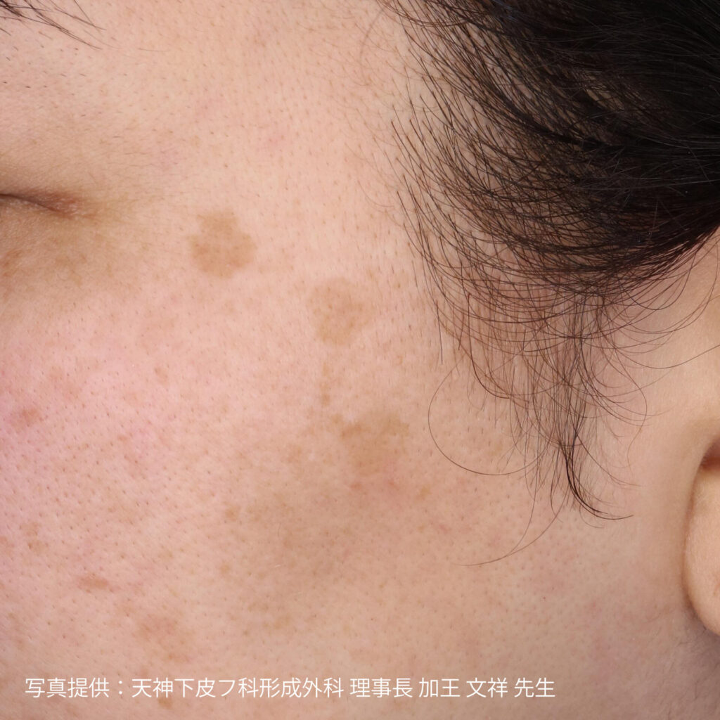 思春期以降、目の周囲に見られることが多く、茶色からこげ茶色の斑点状の色素沈着が特徴です。保険での治療が可能です。