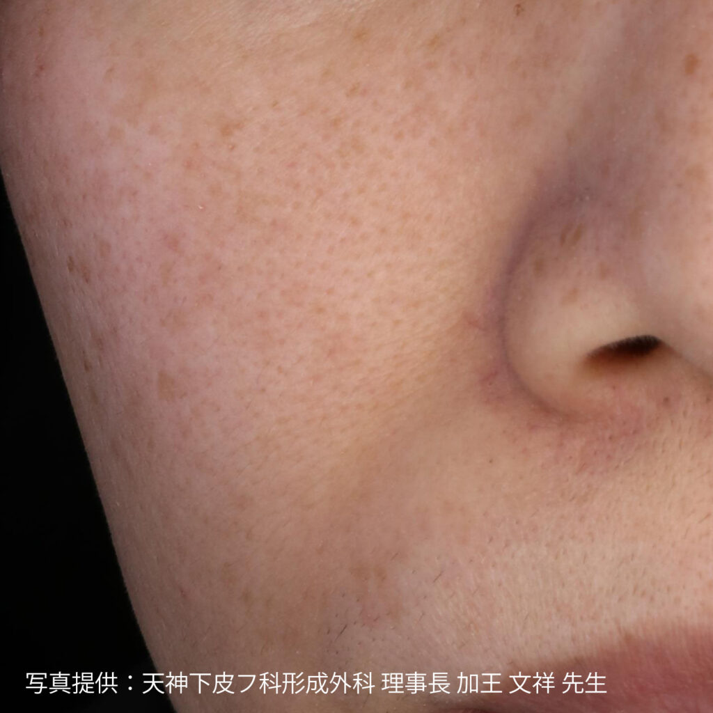 また、この短いパルス幅によって、照射の主作用は「光音響効果(振動による色素の破壊)」が中心となり、従来のレーザーに比べて光熱作用が少ないため、炎症後の色素沈着が起きにくいという利点もあります。