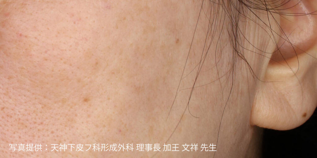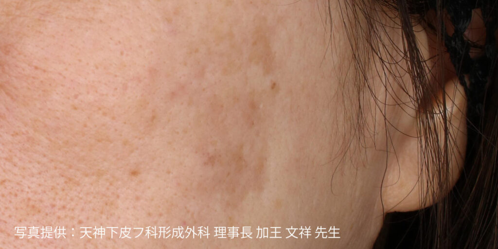 肝斑に対しては、最新機器メドライトC6による「レーザートーニング」を導入しています。この治療法では、微弱なレーザーを毎秒10ショットという高頻度で照射することで、これまで治療が難しいとされていた肝斑にも対応が可能となりました。月1回のペースで継続的に照射していくことが基本です。